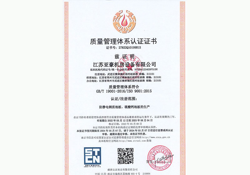 ...江蘇亞豪機房設備有限公司創建于2015年,坐落在蘇錫常中心地帶,是一家專業活動地板制造商,集設計、制造、銷售、安裝一體并通過ISO9001質量管理體系認證。